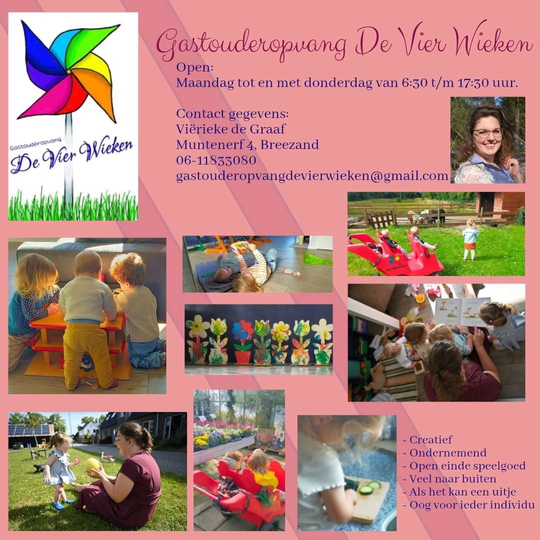 Waarom: Gastouderopvang De Vier Wieken! Ruime openingstijden met in overleg ruimte voor meer uren. Door de maximale aanwezigheid van 4 kinderen is er genoeg ruimte voor ieder kind. De ligging is rustig gelegen en daardoor is er alle ruimte om buiten te spelen. Het grootste deel van het speelgoed is van hout. En creativiteit zal ook iets zijn waar regelmatig aandacht aan wordt besteed. Zoals: tekenen, kleuren, knutselen, dansen, zingen, muziek maken, koken en bakken. Dus al met al vooral veel plezier hebben samen!